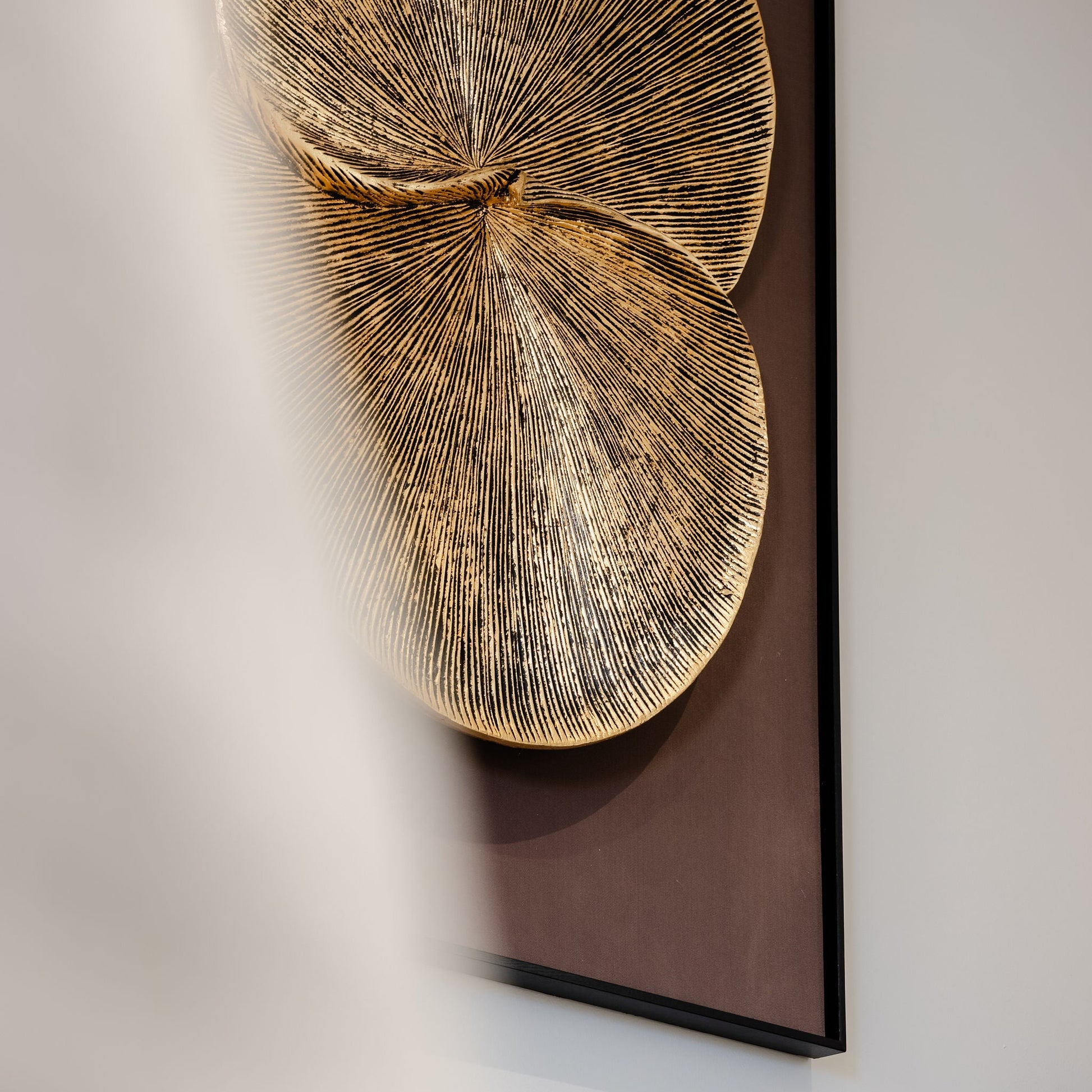 The frame has a minimal design and is made from pine wood. Its black color offers a neutral counterpoint to the gold finish form that fans out from the centre. Use it to complement a luxury interior setting.