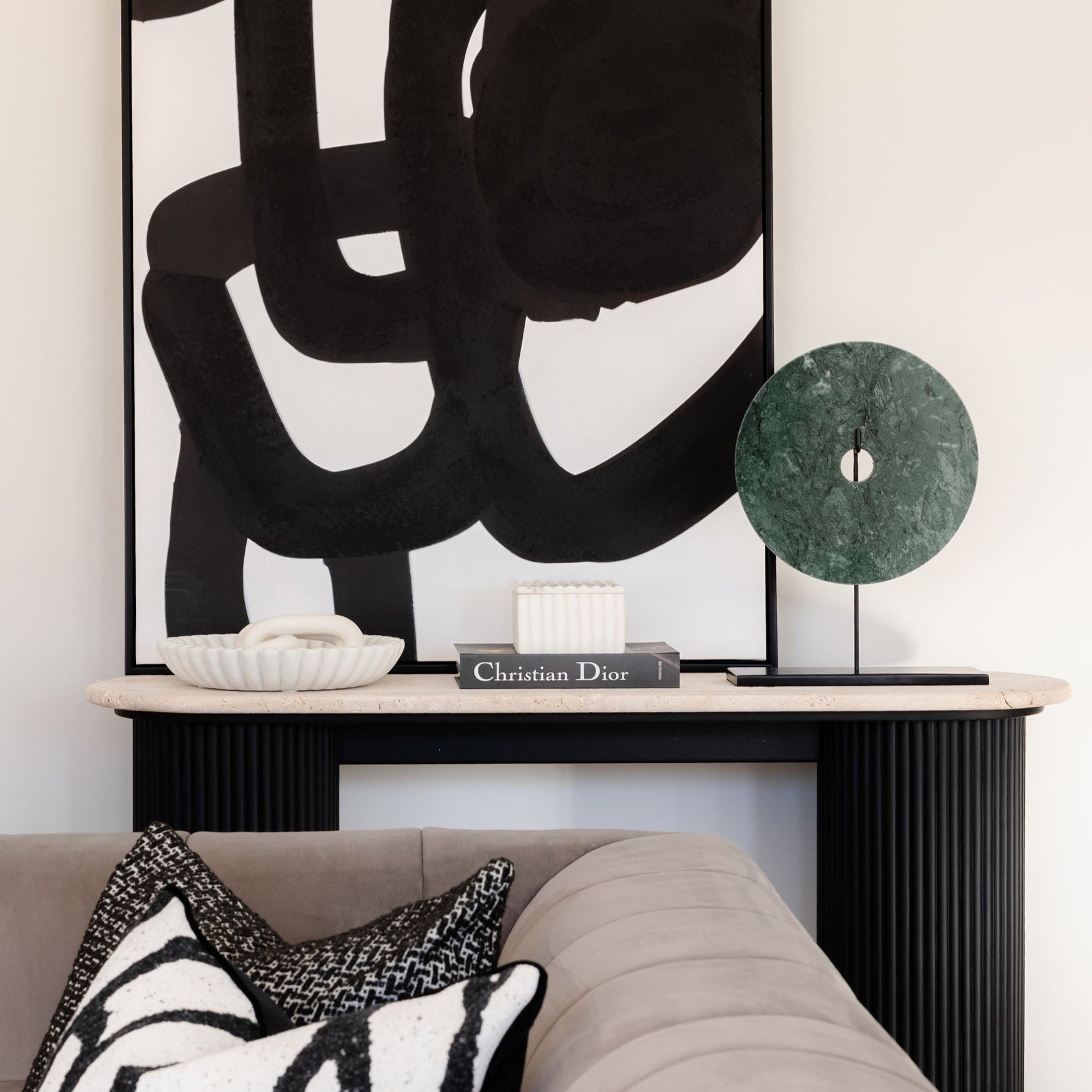 A marble of disc of black with green hues, mounted on a sleek metal stem, complemented by a painted plinth, creating harmonious fusion of natural elegance and modern design.