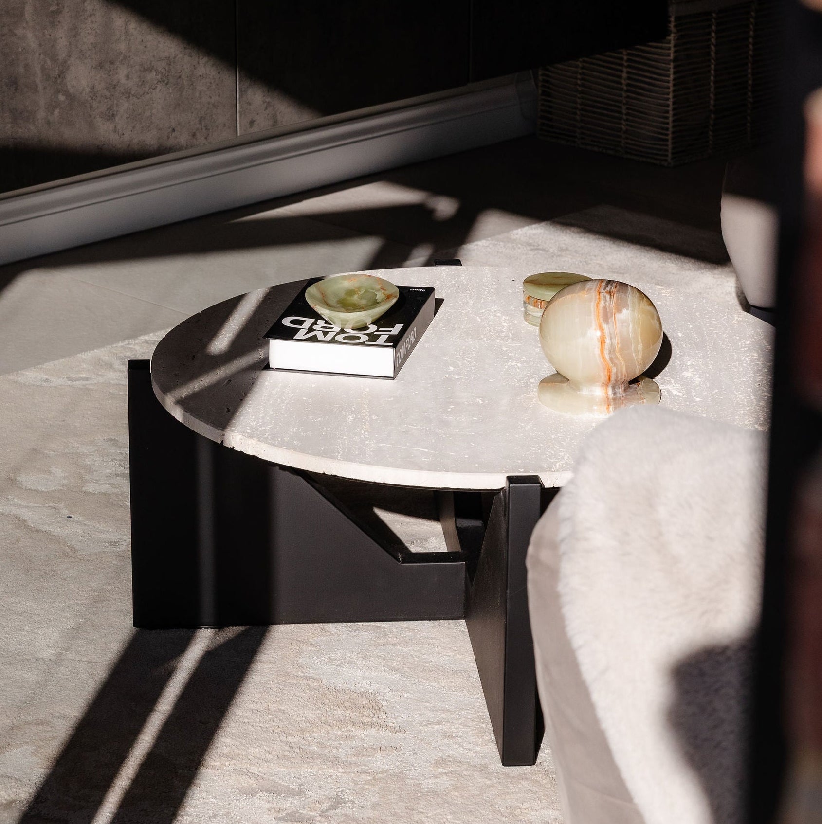 Handcrafted from natural onyx, this decorative sculpture features a smooth globe like top set on a round plinth base. The polished surface and soft tones make it a refined accent for consoles, shelves, or modern decorative settings.