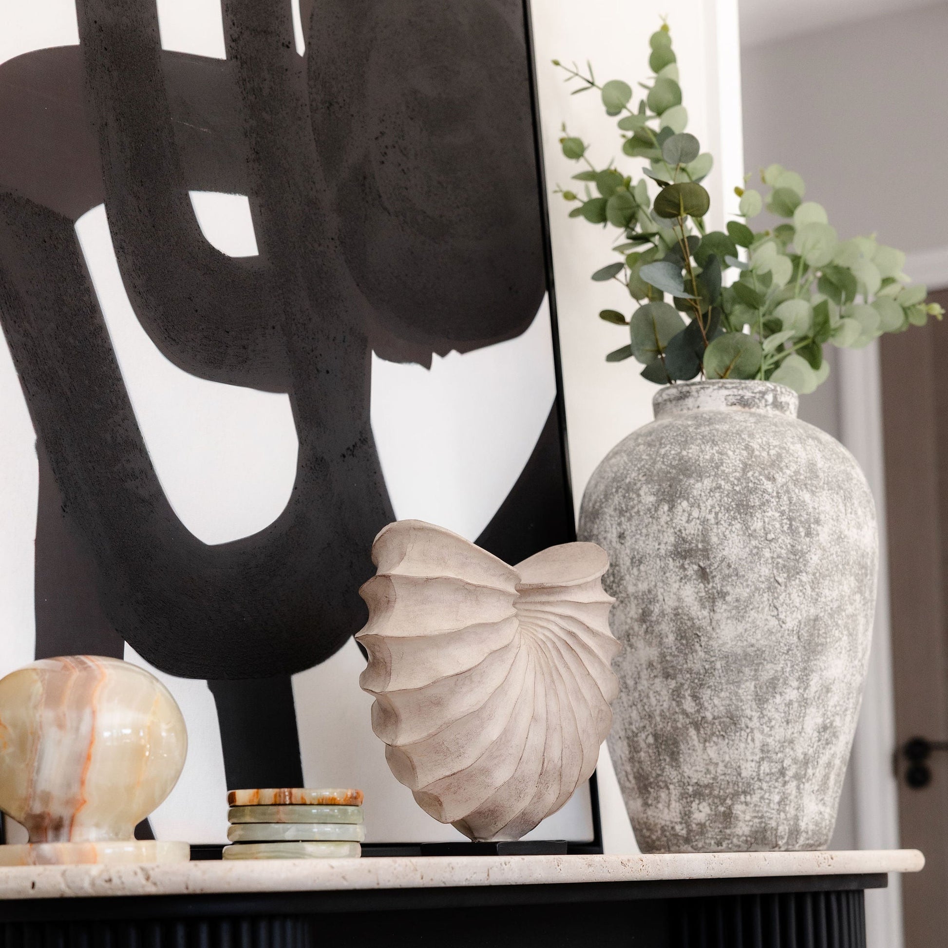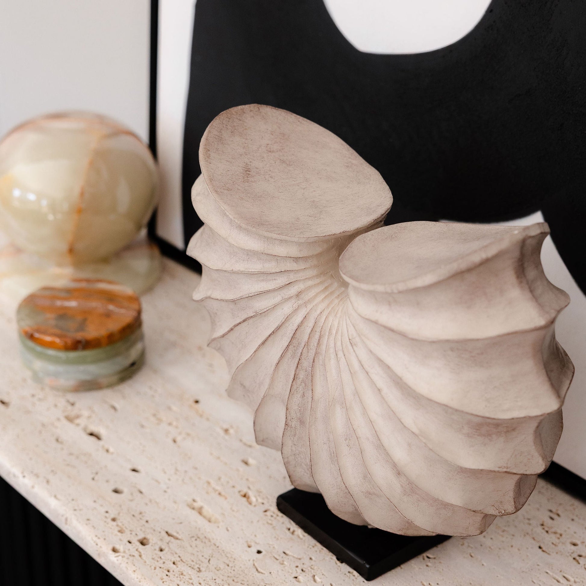 Unveil the essence of the ocean's beauty with this shell sculpture, a stunning piece that brings a serene and timeless beauty of the sea into your home. with dimensions of H27cm x W32cm x D12cm , this sculpture is a captive presence in any room.