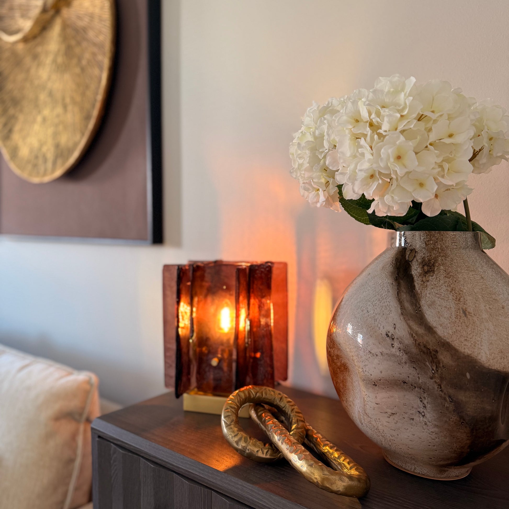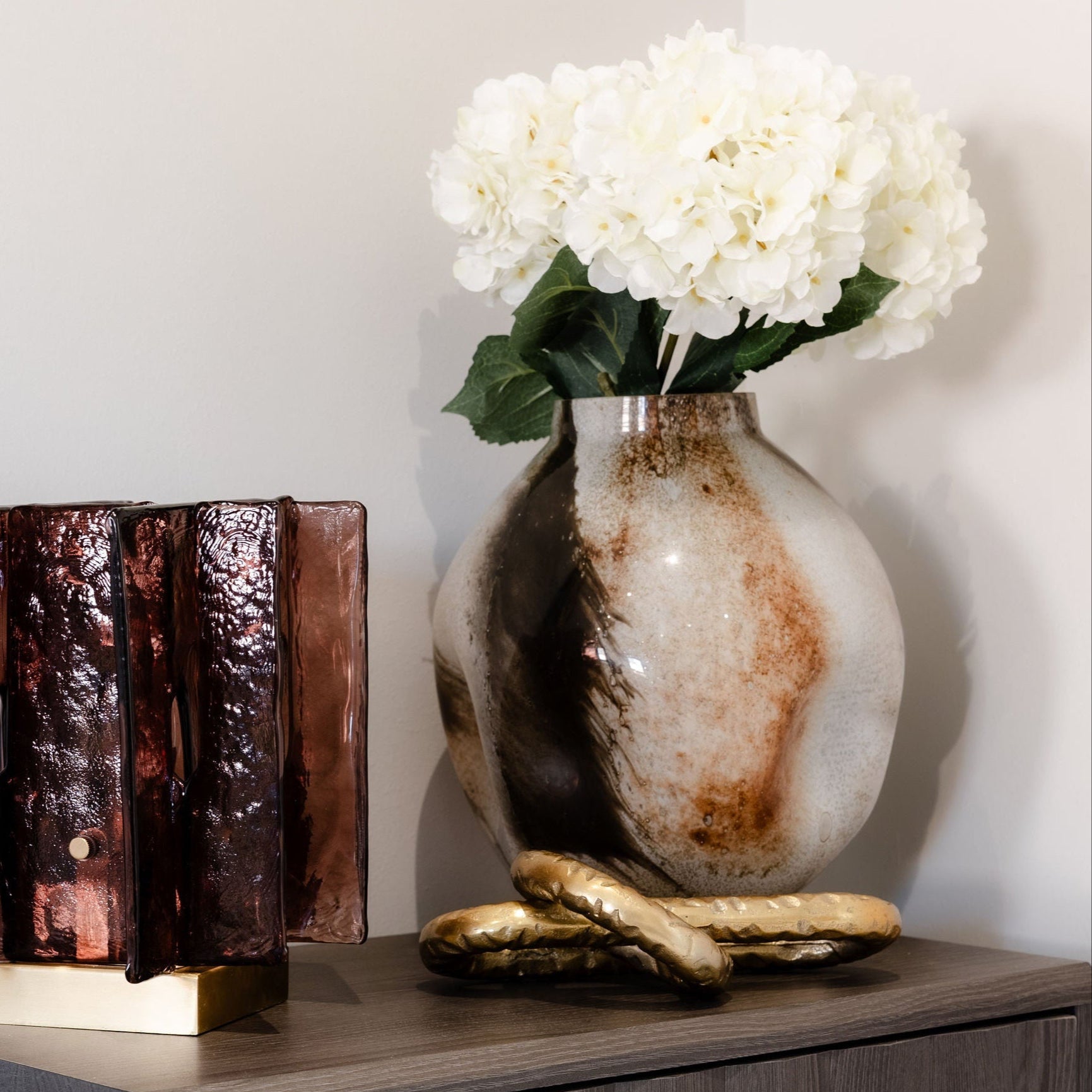 The multicolour hues on this vase exude an earthen appeal that lends an organic charm to the living area. This vase is crafted expertly from robust glass that is supported by a round plinth base and works wonderfully as a standalone piece or filled with bouquets. Matching small vase available