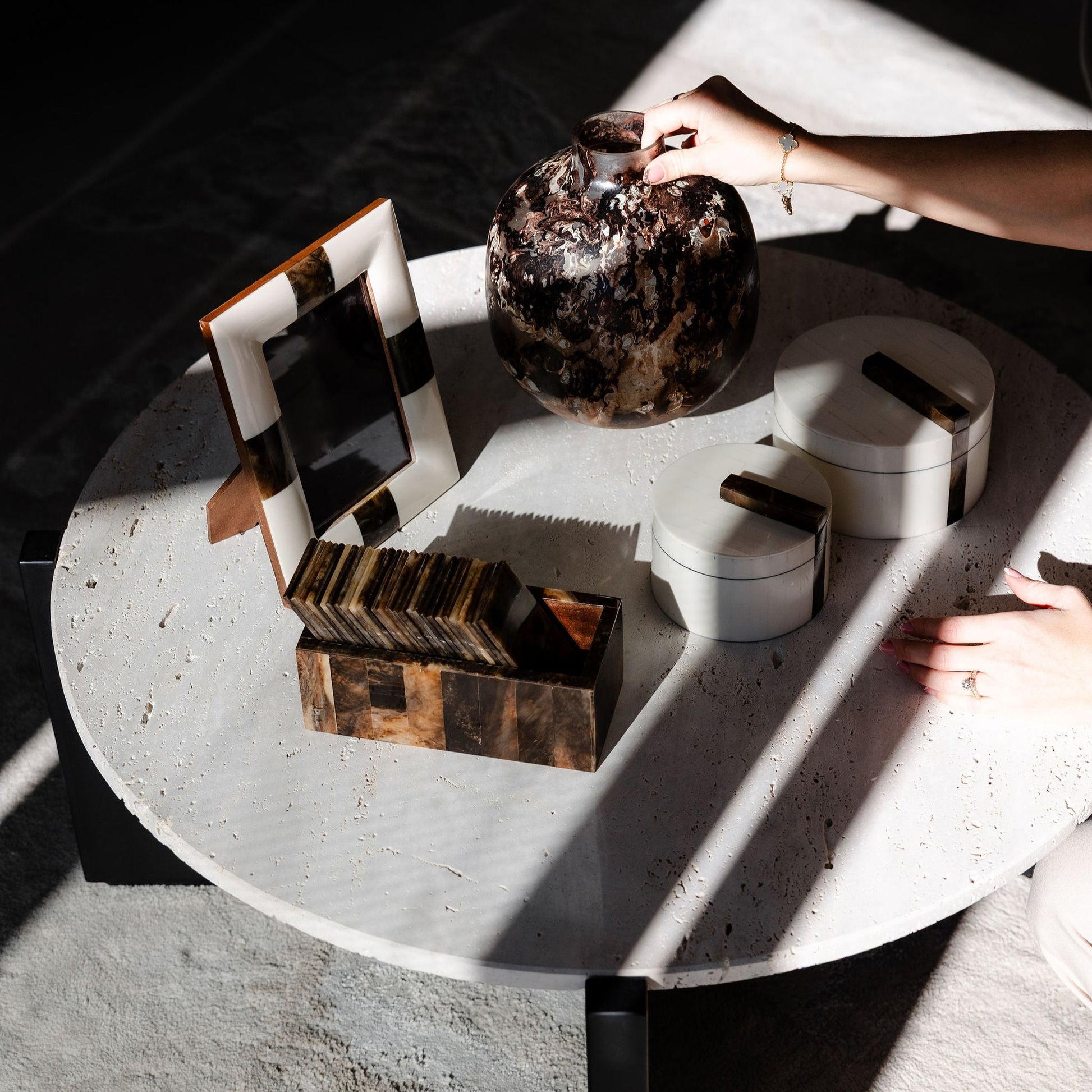 Made from durable MDF, premium resin and bone inlay, this small box boasts a contrasting two tonal look. The cream MDF is countered by brown resin making this natural decor accent suitable for a variety of interior settings.