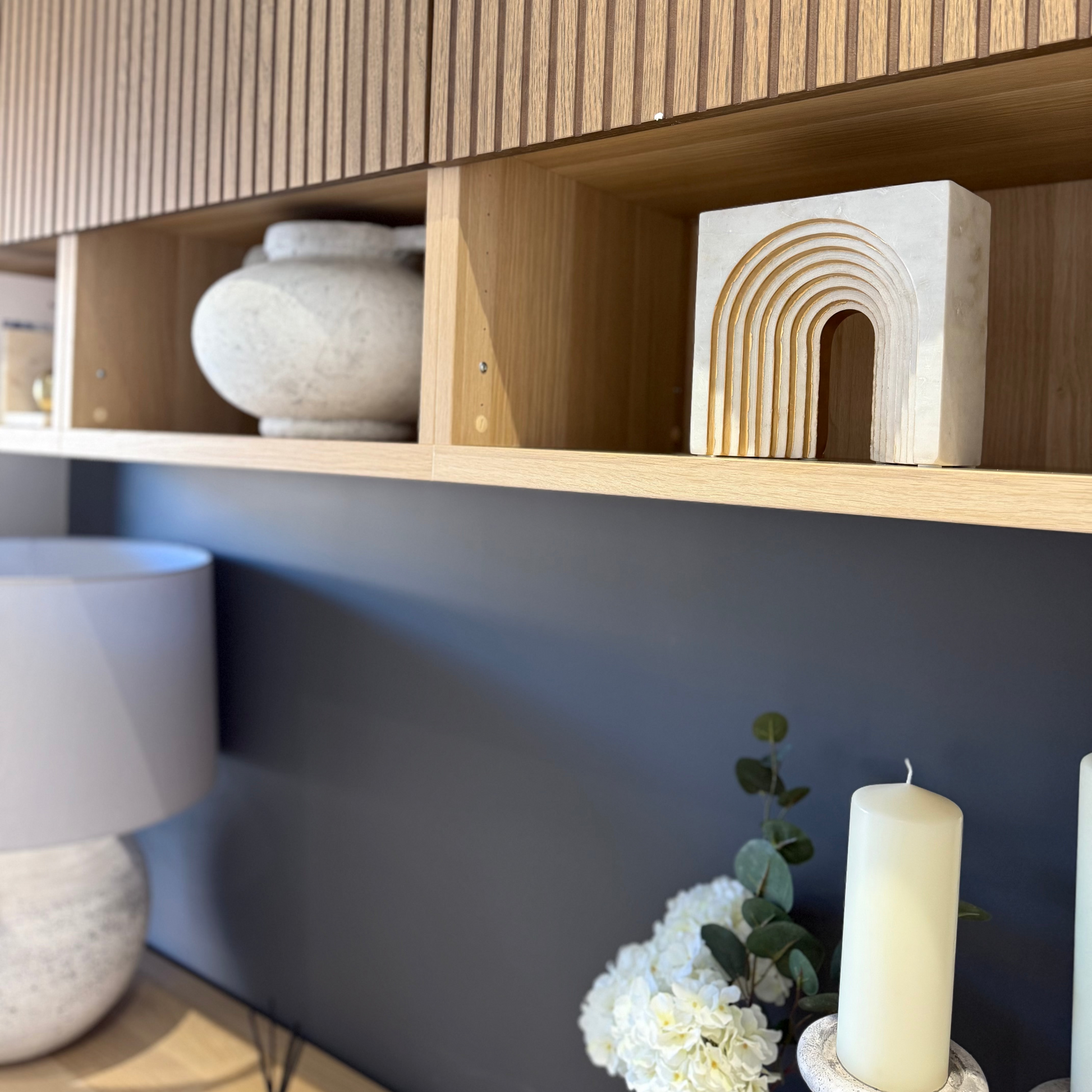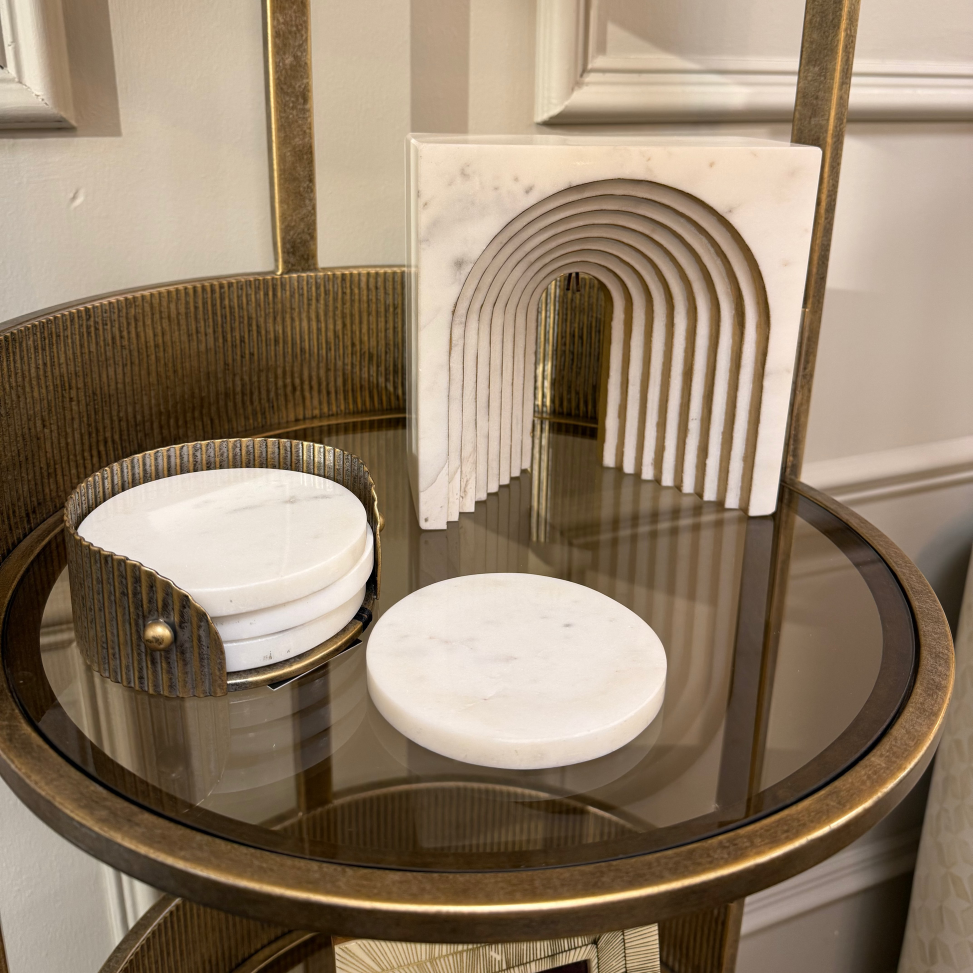 This White Marble Decorative Sculpture is a handmade piece, expertly carved into a layered arch design, making it a striking statement or a mindful addition to any space. The polished marble, with its subtle grey veining, is beautifully accented by a hand painted gold finish along the layered lines, enhancing its architectural appeal.